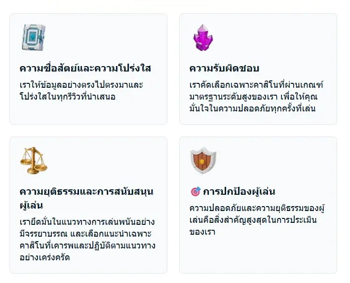 ความโปร่งใส ความแม่นยำ และความปลอดภัยของผู้ใช้งาน คือหัวใจหลักในการทำงานของเรา ทุกเว็บไซต์คาสิโนที่เรานำเสนอผ่านการตรวจสอบอย่างละเอียดจากผู้เชี่ยวชาญ เพื่อให้มั่นใจว่าเป็นไปตามมาตรฐานคุณภาพระดับสูงของเรา